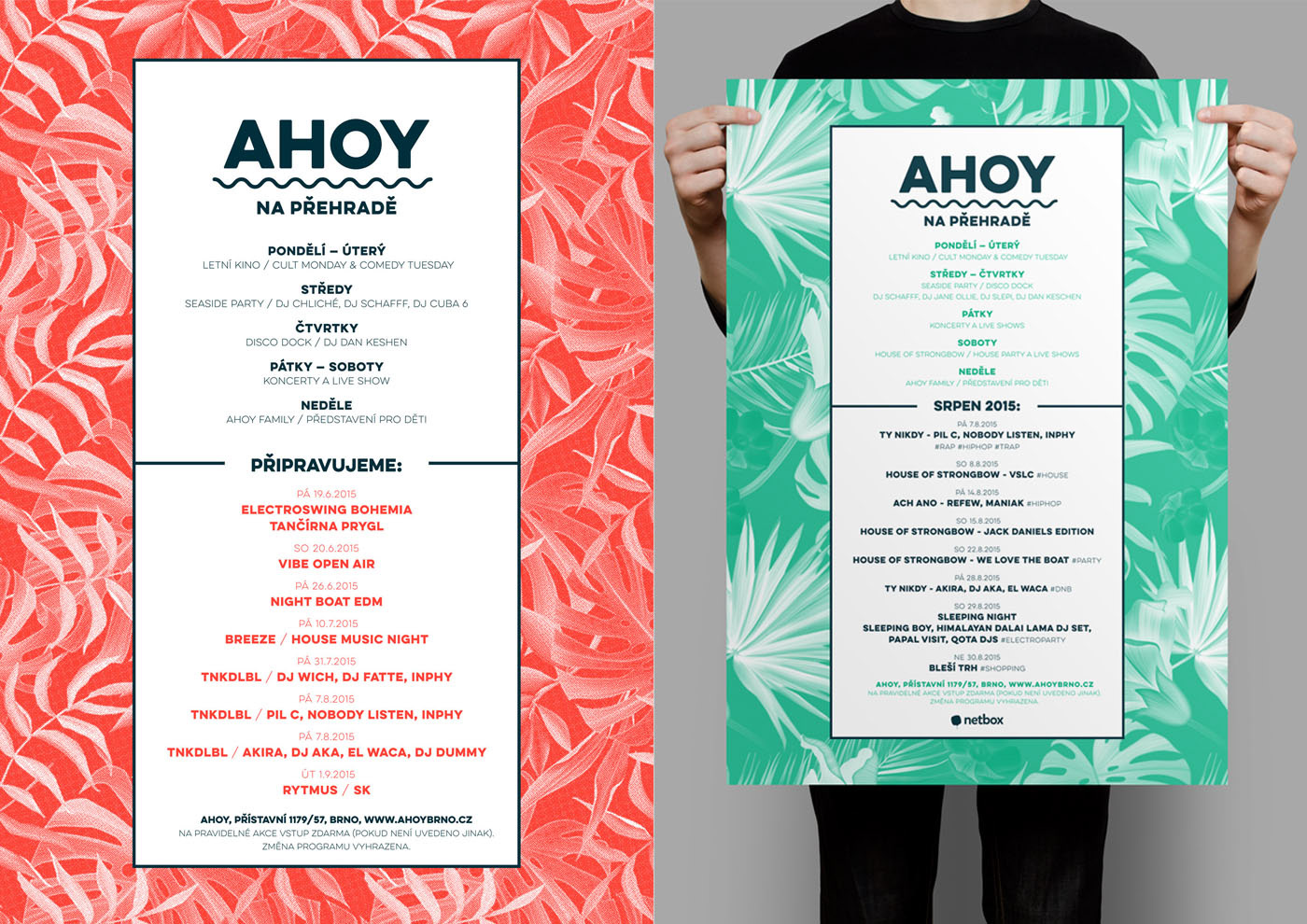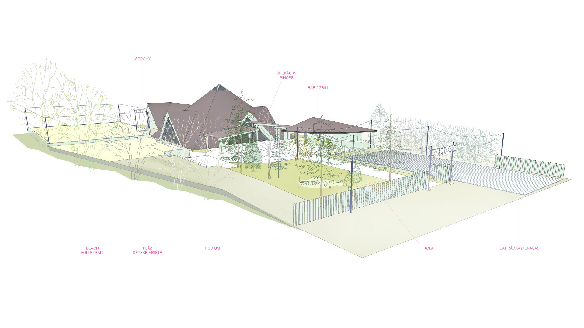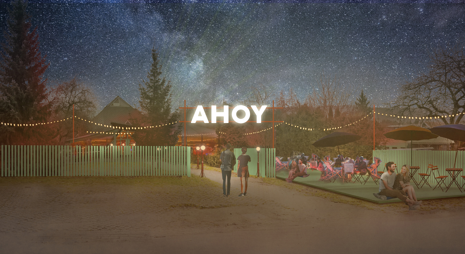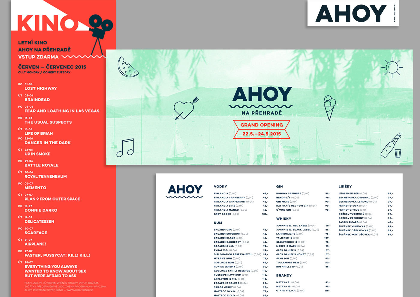 Vytvoření konceptu, logotypu a vizuálního stylu multifunkčního prostoru na brněnské přehradě. AHOY jako tradiční pozdrav námořníků a cestovatelů i symbol shledání a dobré nálady. klient: AHOY