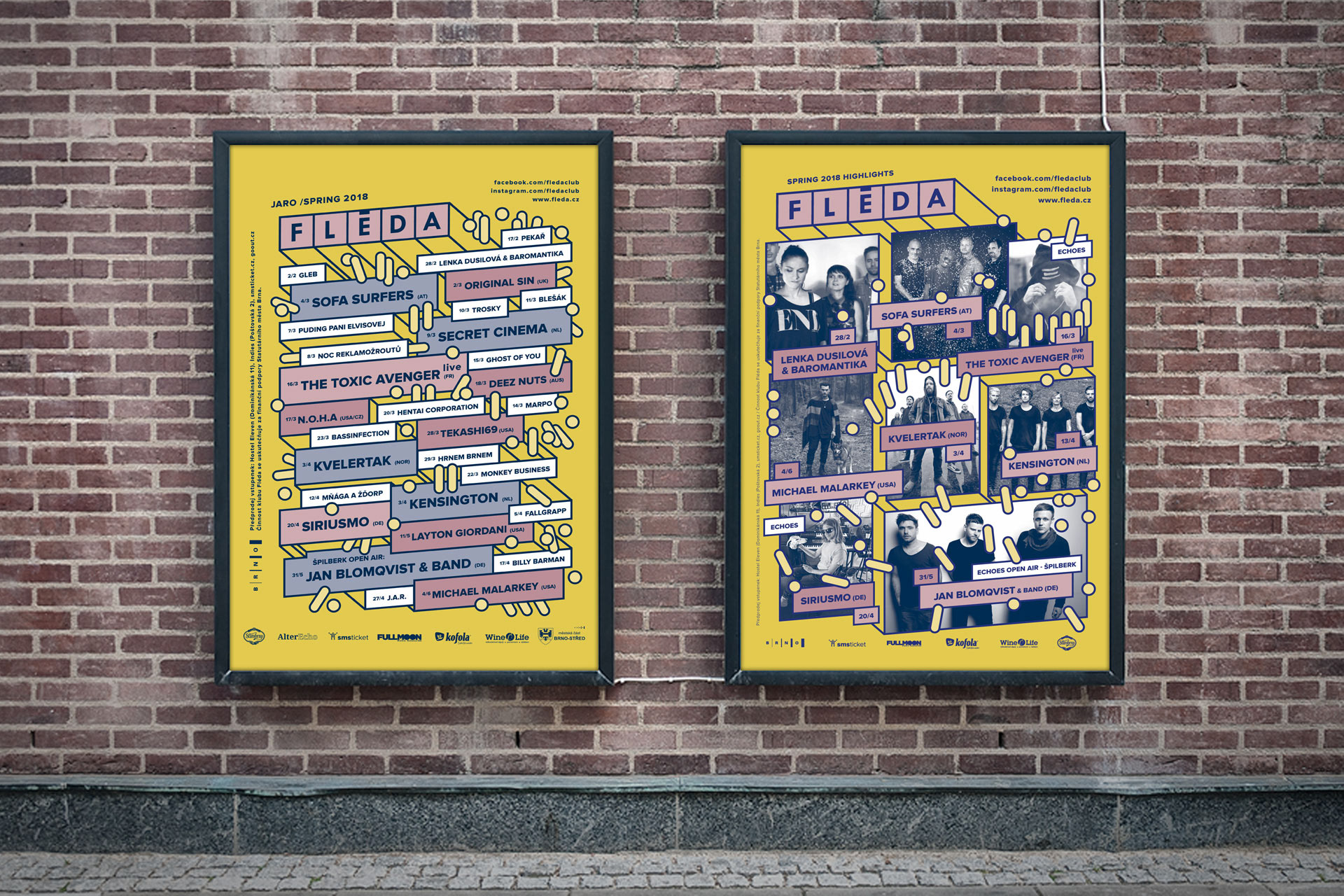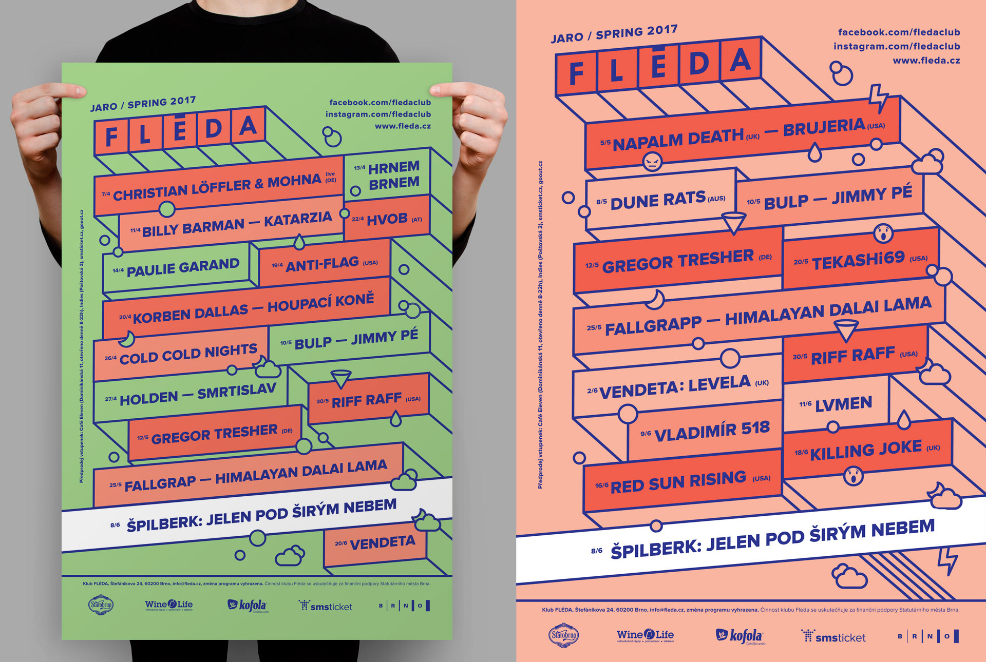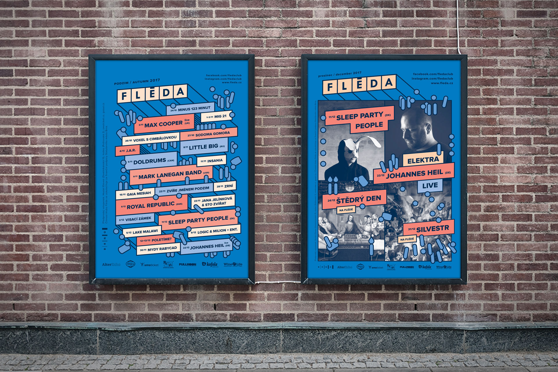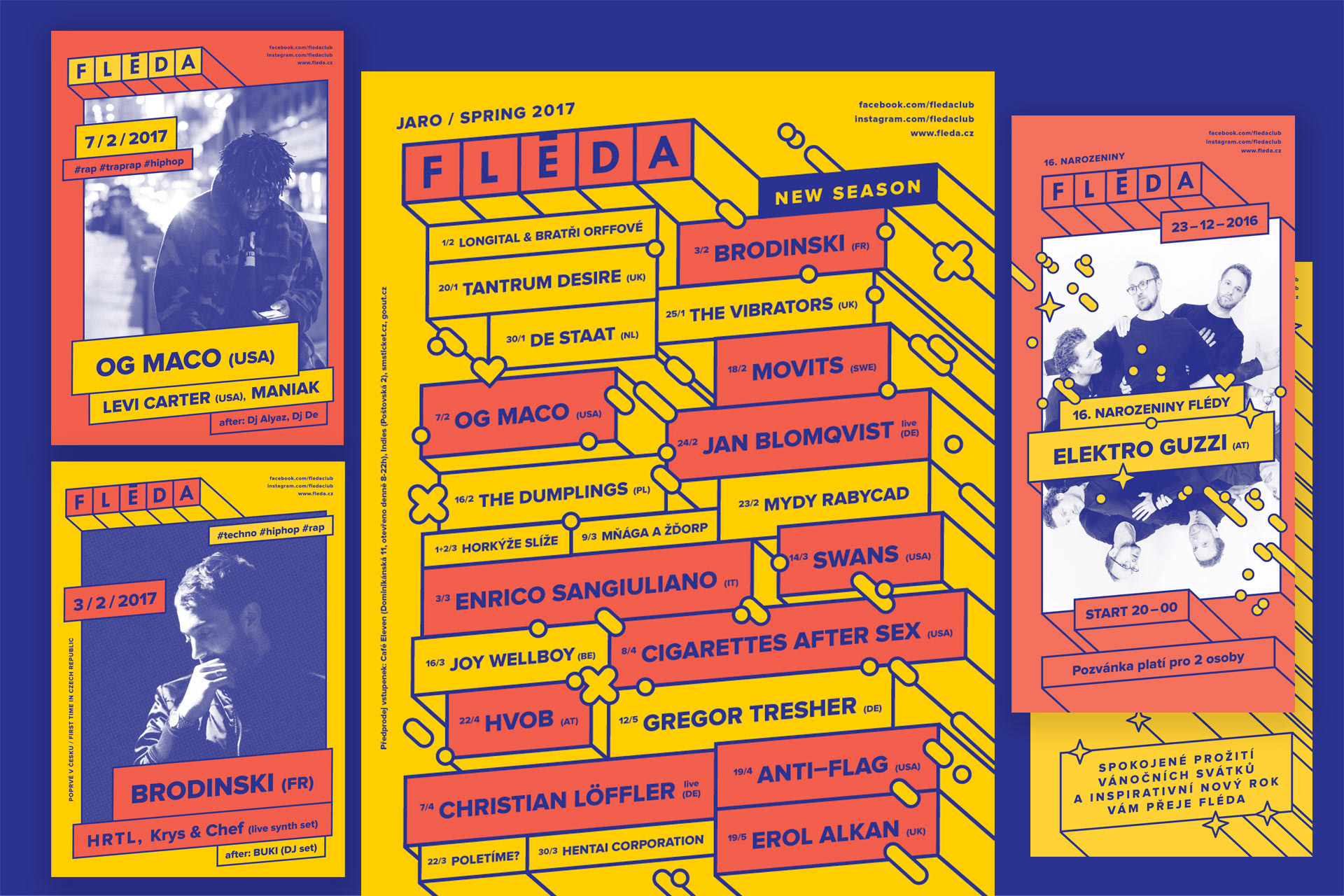 Vizuální podoba kampaně a grafický návrh programových plakátů pro brněnský klub Fléda od roku 2016-2018. klient: Fléda Company