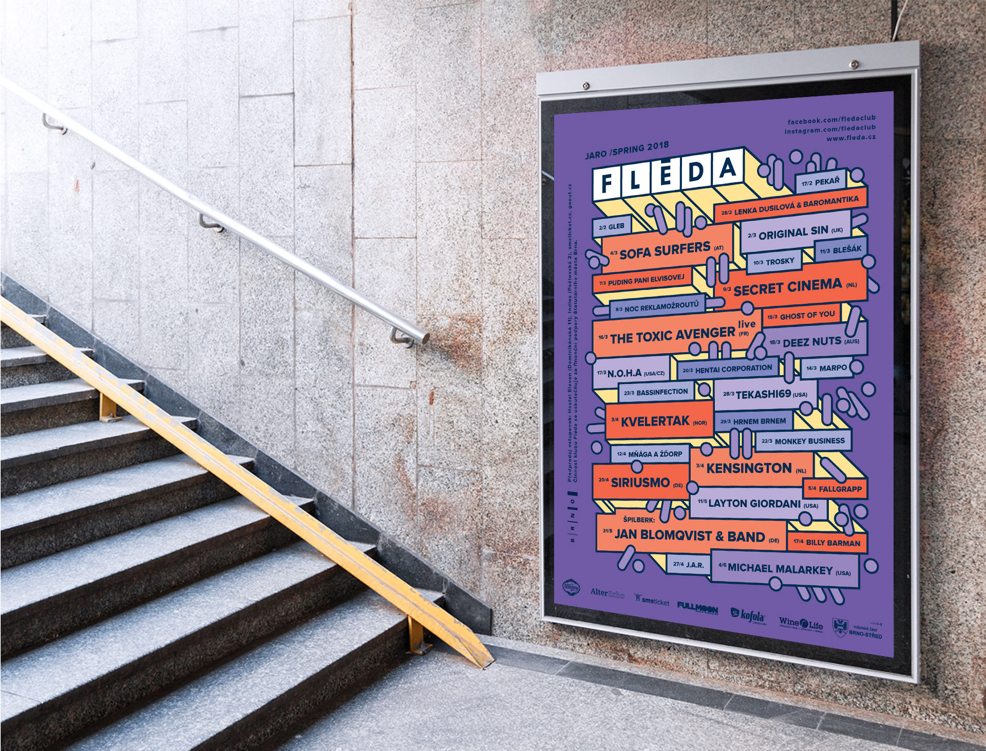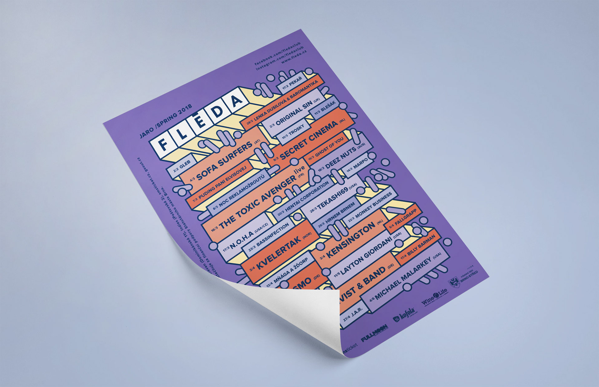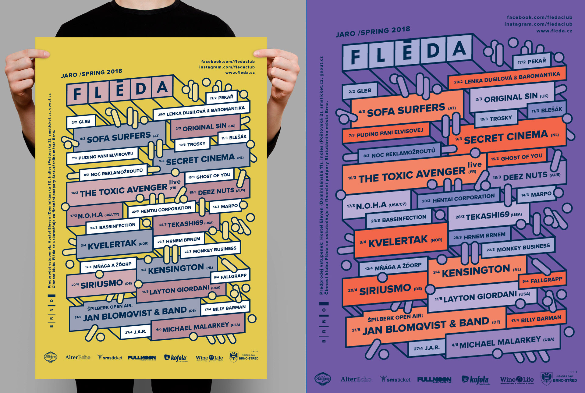 Vizuální podoba kampaně a grafický návrh programových plakátů pro brněnský klub Fléda od roku 2016-2018. klient: Fléda Company