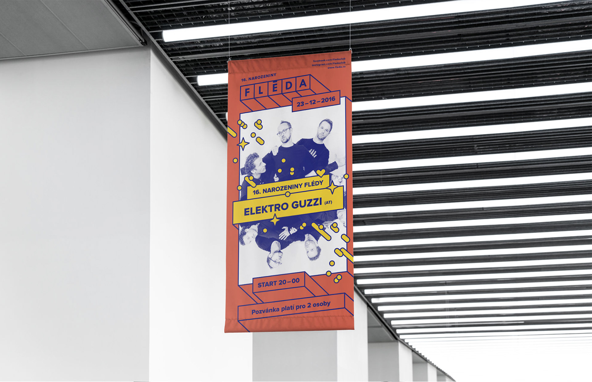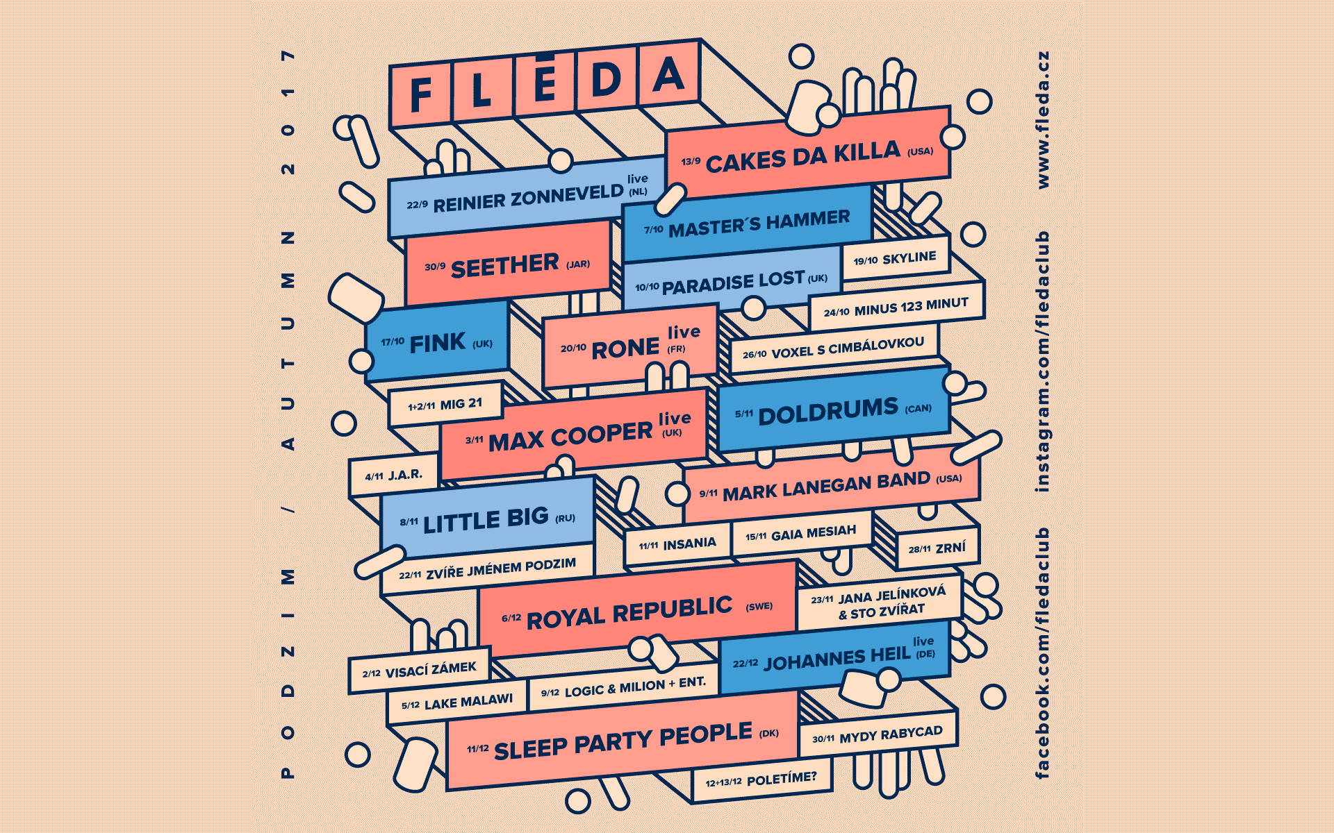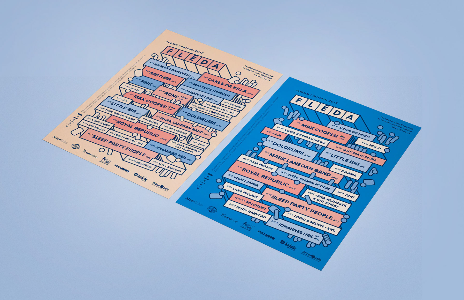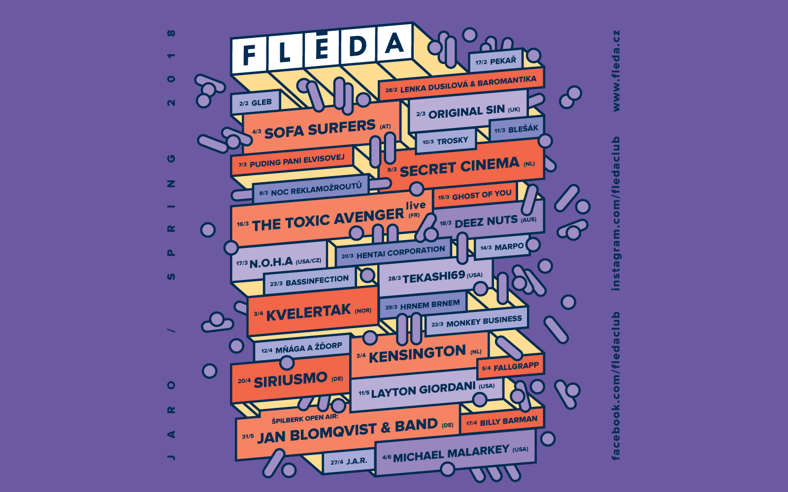 Vizuální podoba kampaně a grafický návrh programových plakátů pro brněnský klub Fléda od roku 2016-2018. klient: Fléda Company